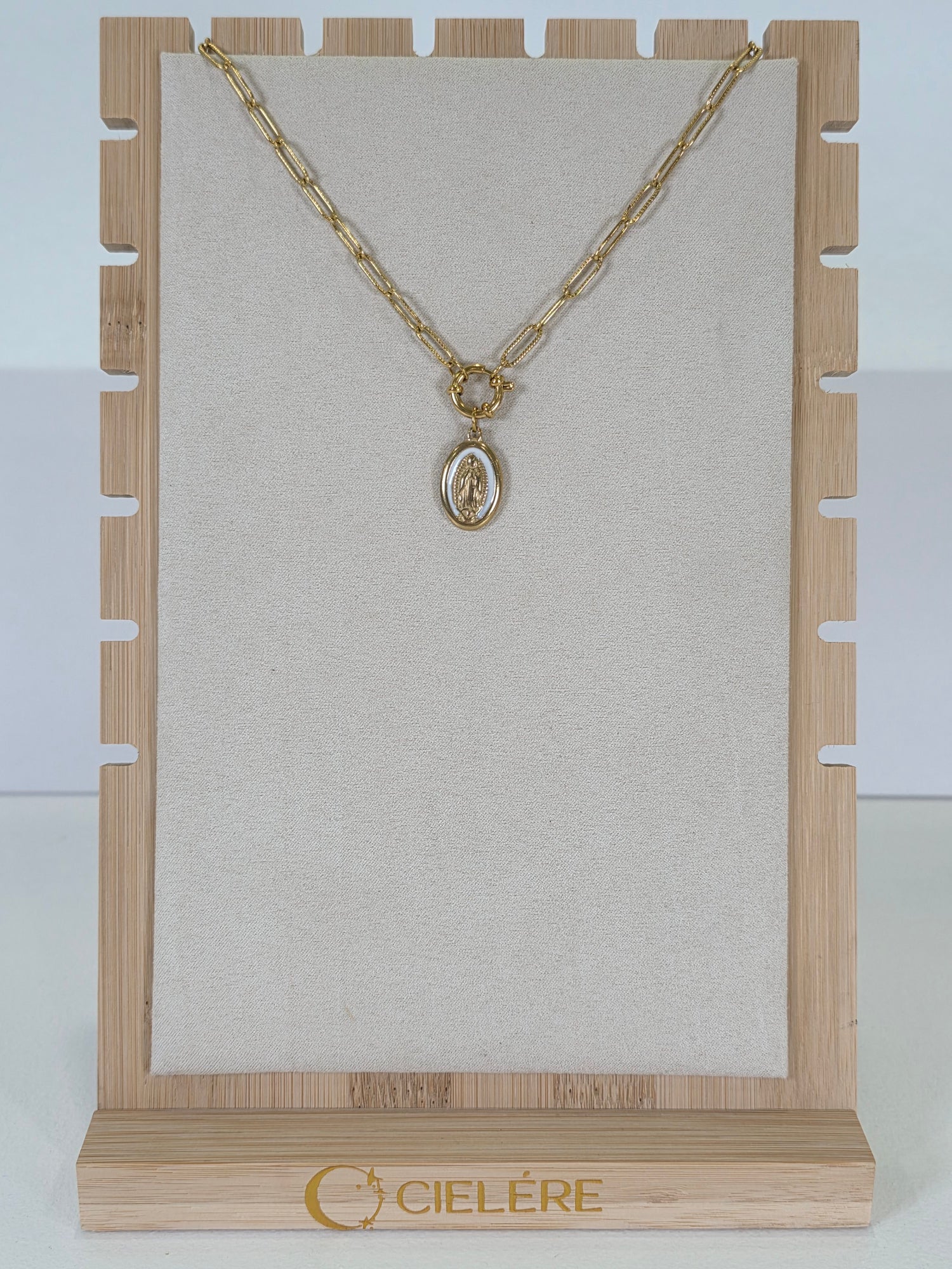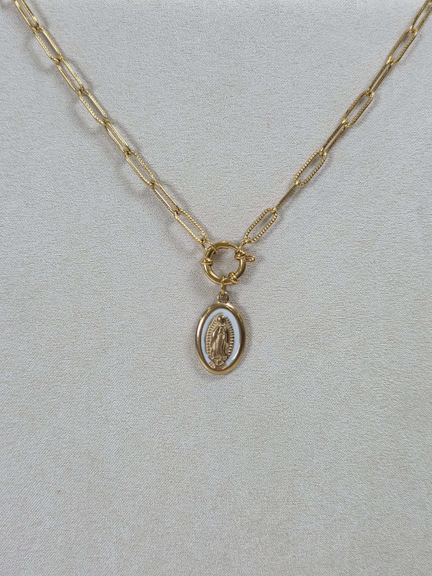 Soft, classic, and beautifully timeless. The Oval Virgin Mary Necklace features a smooth gold oval pendant with a detailed depiction of the Virgin Mary, paired with a fine gold chain. A piece that offers quiet comfort, protection, and elegance wherever you go.