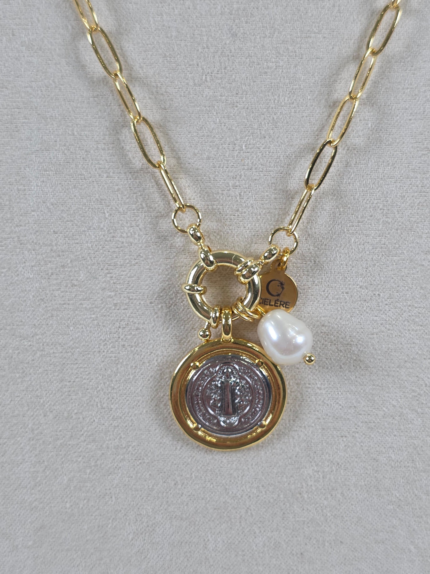 Graceful, radiant, and full of symbolic beauty. The Pearl & Medallion Layered Charm Necklace features a gold link chain adorned with a classic religious medallion, a luminous pearl charm, and a petite gold disc. This multi-charm design offers a meaningful, elevated look — perfect for layering or wearing as a standout piece.