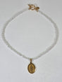 Bright, delicate, and quietly radiant. The Imitation Pearl Sacred Medal Necklace features lustrous imitation pearls that shimmer beautifully in the light, paired with a gold oval religious medallion. A soft, graceful piece that brings refined elegance to any look.