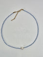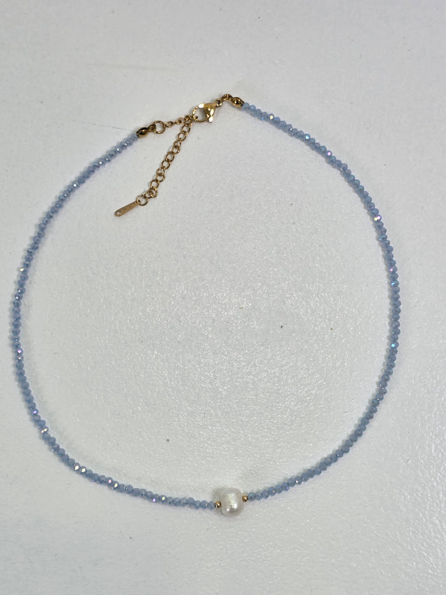 Calm, airy, and effortlessly graceful. The Blue Petal Glow Necklace showcases icy blue faceted beads paired with a glowing freshwater pearl, creating an ethereal piece that adds a soft touch of color and light to your neckline.